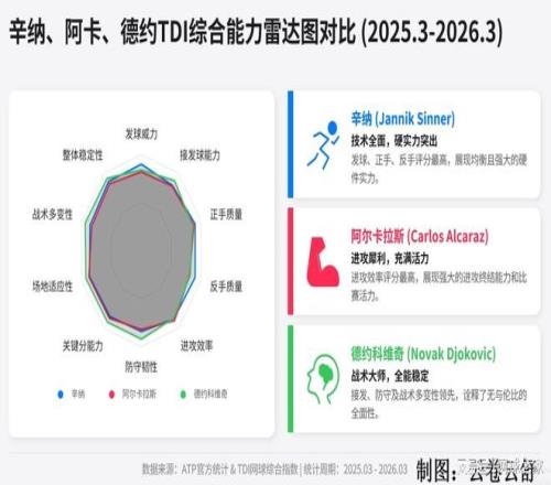 结合近52周ATP官方公开数据,午夜性福利视频依然以辛纳、德约、阿卡三位球员为例,对比他们的TDI整体评价指标,既能直观理解TDI整体评价指标的作用,也能清晰看出三人整体风格的差异。